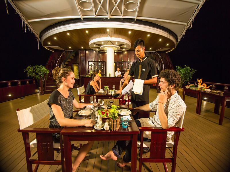 20:30: Have dinner and free time for communicating with staffs, evening activities (squid fishing, beauty spa…) and service on board. Overnight on board.