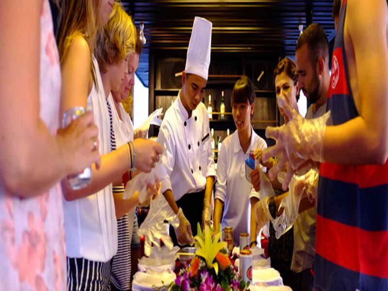 17h45: Returning your Halong Bay Cruise boat you can watch the magnificent sunset over the Gulf of Tonkin. Onboard you may join a traditional cooking class. Our chef will instruct you in the making of some Vietnam dishes. In the early evening the boat has its Happy Hour deal.