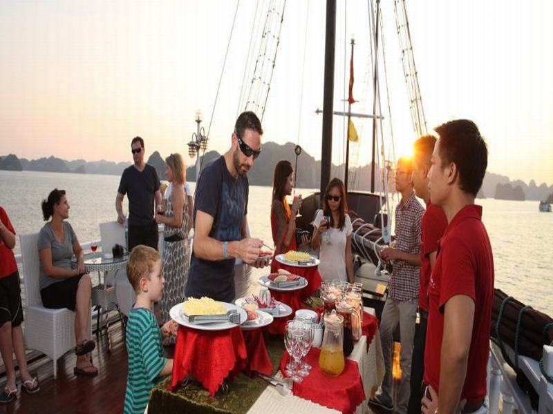 16:45 Drop anchor in the calm water surrounded by islets in Cong Dam Area. Happy Hour (sunset party).