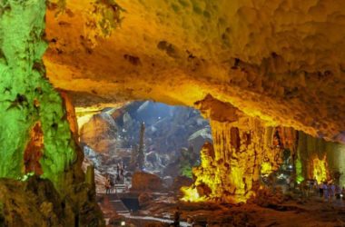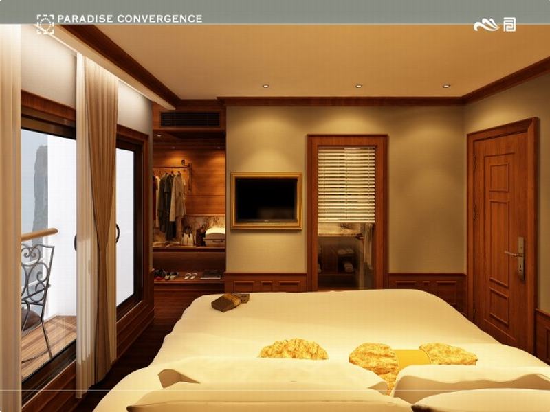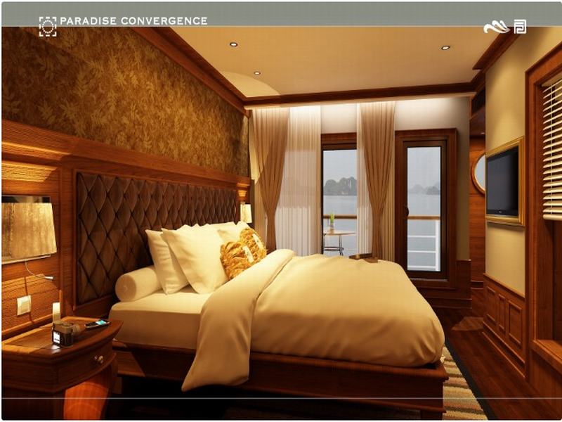 13.00 – 14.30 Serve Special Paradise Lunch on board while cruising passing by islets, Hoa Cuong fishing village. After lunch continues exploration of Halong Bay passing by Soi Sim Beach, Coconut Three Island. Anchoring the vessels at Dark and Bright Cave area.