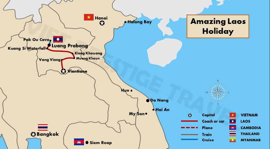 Then, take a drive to to Kuang Si Waterfall. This waterfall is located in a perfect natural setting near Luang Prabang, this multi-tiered waterfall tumbles over limestone formations into a series of turquoise pools. Enjoy swimming in the clear water or just relaxing in the natural environment. Continue to visit a local village (Ban Ou or Ban Na Ouane) on the way, before returning to Luang Prabang by vehicle. In the evening, explore Luang Prabang Night Market. The street is closed off to vehicles and the hill-tribe traders emerge with their various apparels, ceramics, bamboo, lamps, blankets, bed covers, handicrafts and silk scarves. Overnight in Luang Prabang.