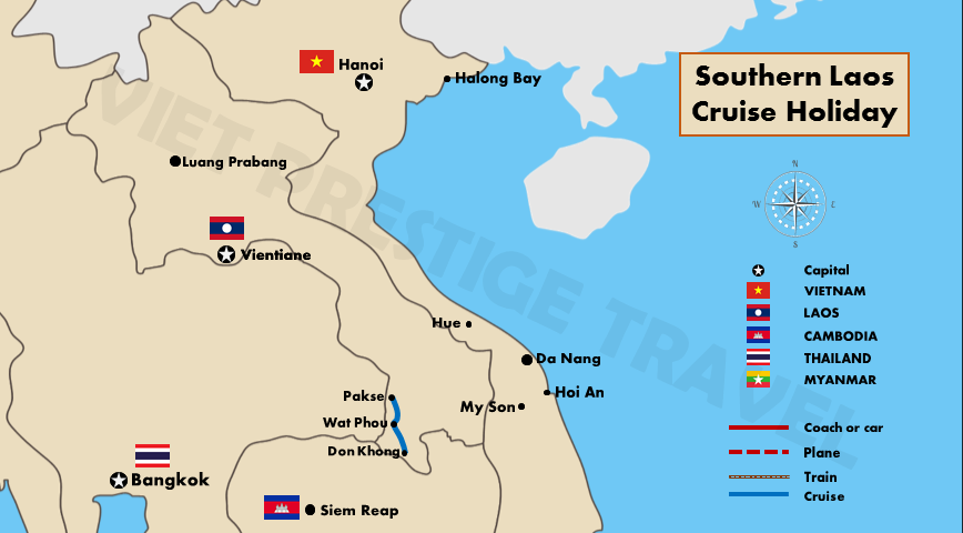 A bus transfers you to the historically significant Khone Pha Pheng waterfall, “the Niagara of the East”, close to the Cambodian border. We bring you back to Pakse for the end of cruise experience, arriving around 16h00 p.m. You will then be transferred to your hotel for the night.