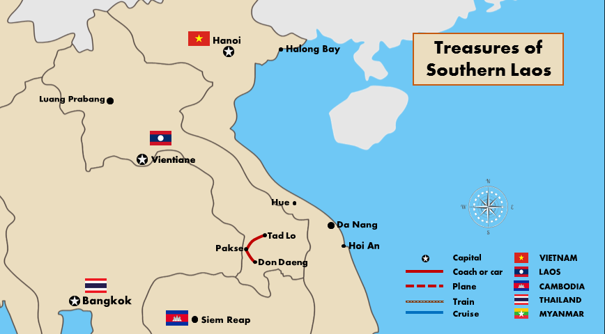 On arrival at Pakse Airport, you will be met and transferred to Tadlo, passing many charming villages and rolling hills. The deep contrast between the lush, green vegetation and the red surface of basaltic soil is an incredible thing to see as you pass along. Then stop at tea and coffee plantations, followed by a stop at Tad Fan Waterfall, a picturesque twin chute waterfall. Continue to explore another interesting minority village, Ban Bong Neua, an Alak village boasting a sacrificial altar. You arrive at the beautiful Tadlo Waterfall in the afternoon, where you have the rest of the day at leisure for stroll around, swim on the river, watch the elephant bath and enjoy sunset over your Lao beer. Also option of a short elephant ride to take in the beautiful scenery. Overnight at Tadlo.