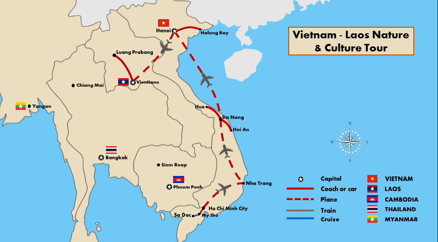 Today, free at your leisure until transfer to Noi Bai Airport to catch your flight to Vientiane. On arrival in Vientiane, you will be welcomed by local tour guide and then transfer to the hotel for check in. Take a rest and enjoy a full day to explore Vientiane- the charming and fascinating capital of Laos, one of the classic Indo Chinese cities which conjure up exotic images, with its intriguing mix of Lao, Thai, Chinese, Vietnamese, French, American and Soviet influences. Our visit will take you to the key sites: National Museum, Wat Sisaket the city ‘s oldest surviving temple with thousands of silver and porcelain images in the gloriously authentic temple compound that offers you a glimpse into the Vientiane of the past, the next stop is Haw Phra Kaeo. This large temple is beautiful both interior and exterior, it was built to house the famed Emerald Buddha in courtyards filled with frangipani trees.